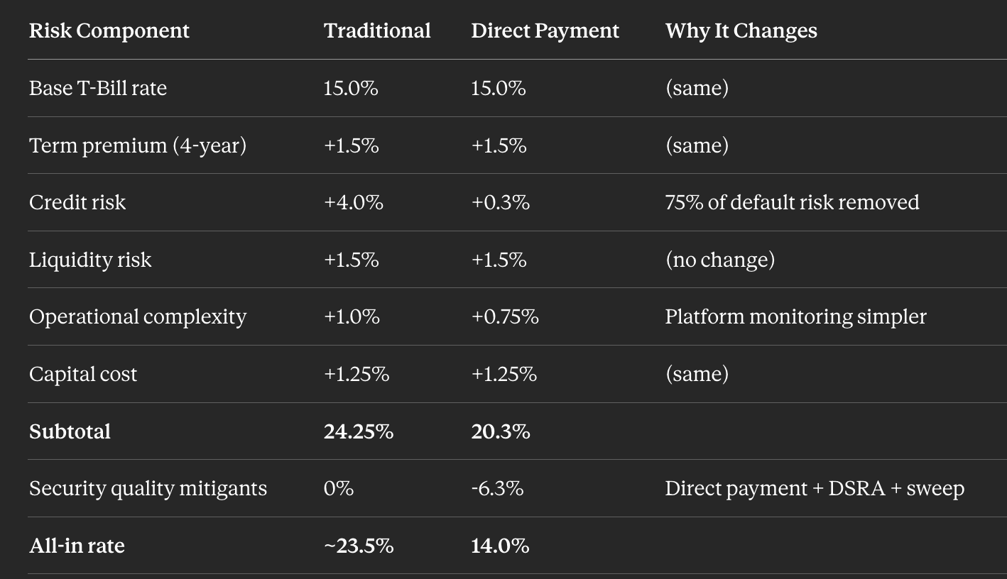 Why? Because the market misprices the asset. Banks see “exotic IP collateral” and apply distressed asset discounts. Direct payment converts it to “platform receivables” but the market hasn’t caught up yet.