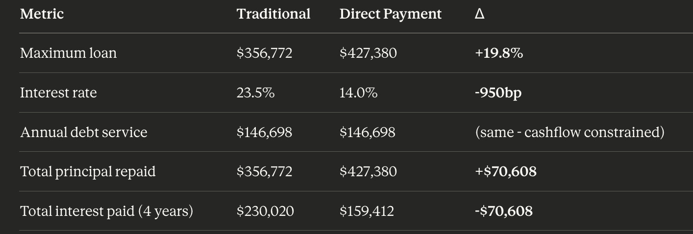 Difference: 20% more lending capacity. 950 basis points lower cost. $70,608 in interest savings over four years.