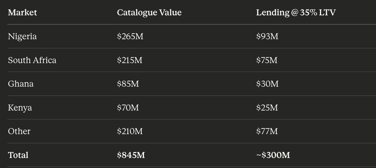 African music catalogues generate ~$800M+ in annual streaming revenue. At 8-12× revenue multiples (standard for IP with 15-20 year cashflow tails), that’s $6-10B in catalogue value.