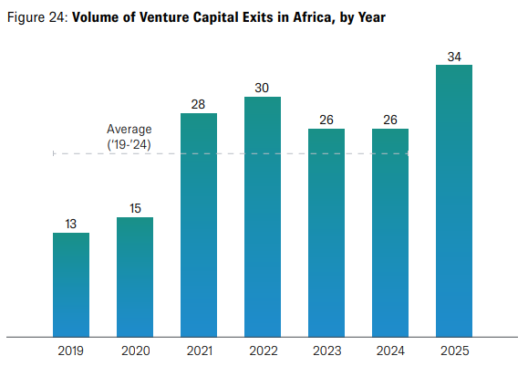 Exits rose 31% to 34 transactions in 2025. African-based buyers accounted for 54% of them.